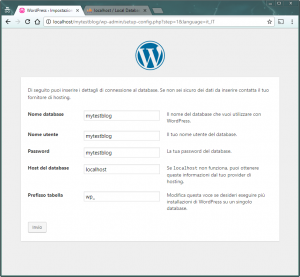 Come ci ricorda la prima schermata, abbiamo bisogno di conoscere le informazioni sul database che ospiterà il sito di test.