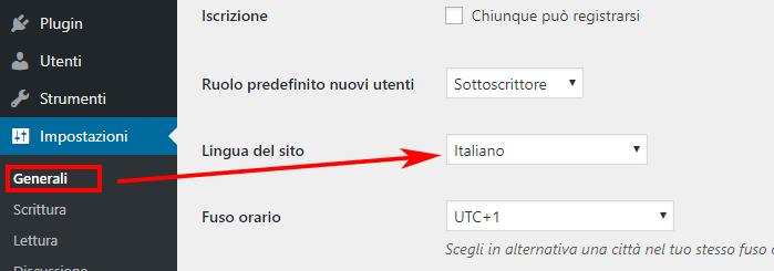 Innanzitutto assicurati che la lingua di WordPress sia impostata in Italiano (se non l’hai già fatto).